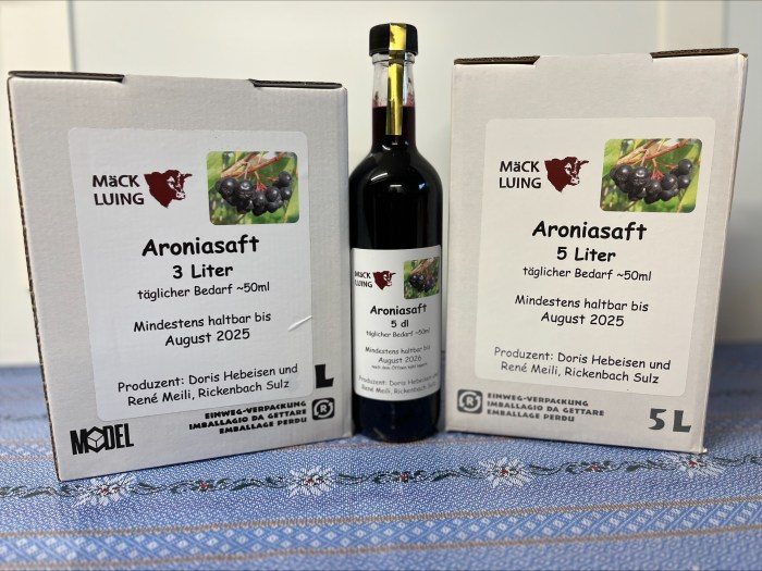 Aroniasaftgebinde: 5dl Flasche, 3lt Bag in Box und 5lt Bag in Box